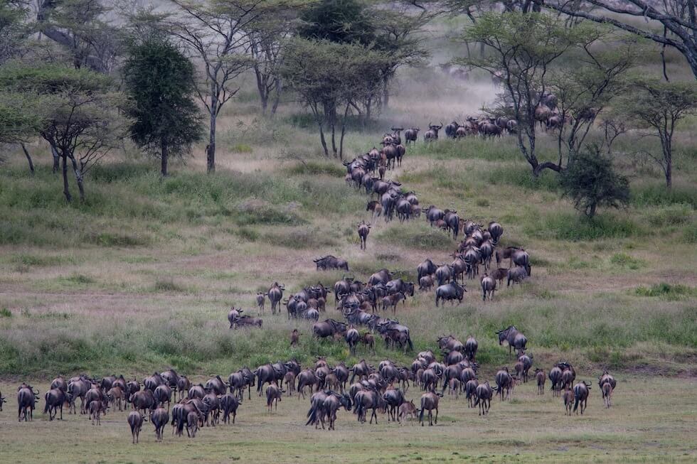 Tarangire National Park, spanning 2,850 square kilometers, is characterized by its large herds of elephants and ancient baobab trees. The park’s landscape is marked by the Tarangire River, which attracts wildlife during the dry season. It offers a quieter, less crowded safari experience with a high concentration of wildlife, including various bird species and seasonal migration of wildebeest and zebras.